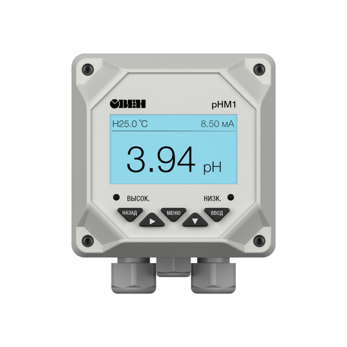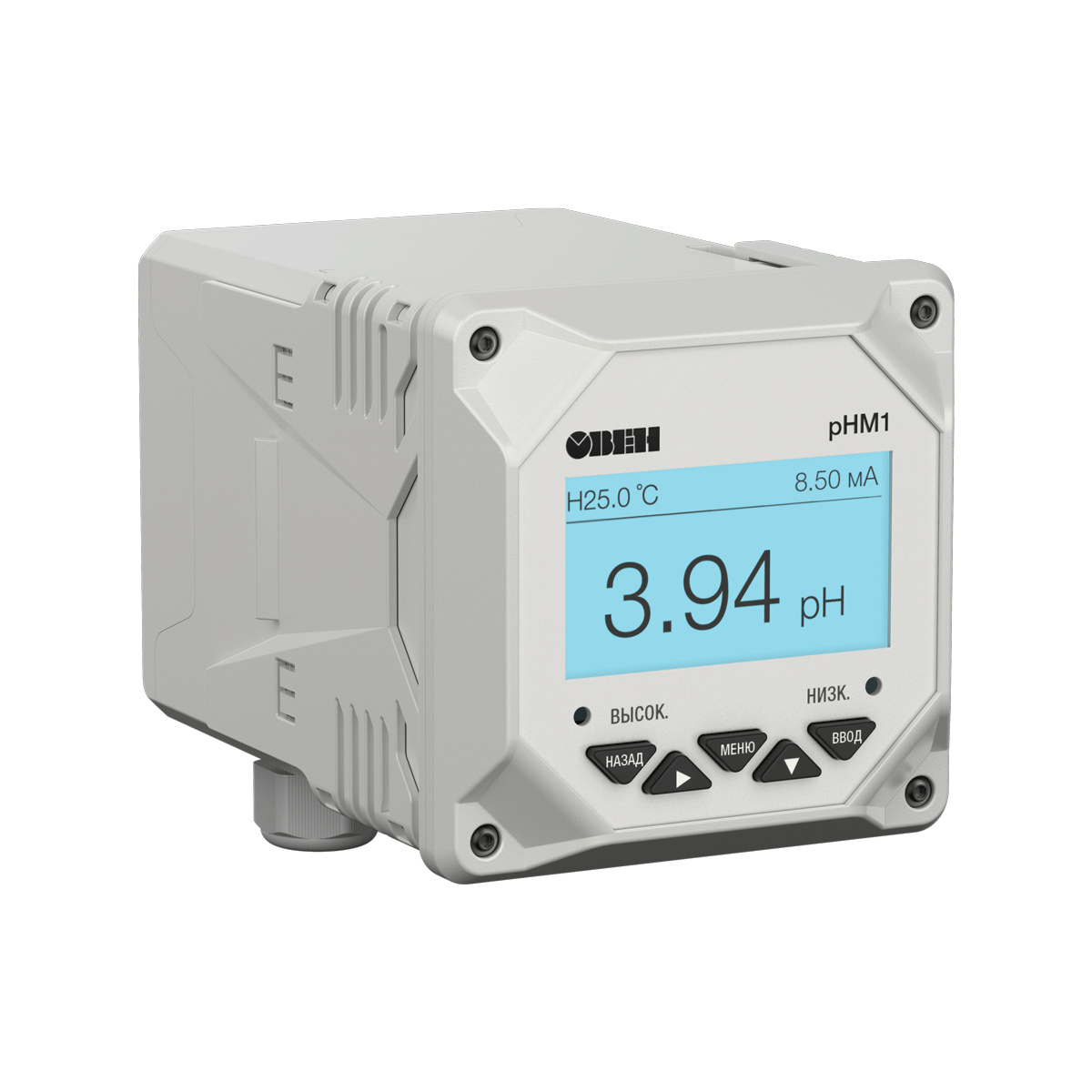 Промышленный pH-метр pHM1 предназначен для измерения уровня кислотности воды (pH), передачи данных по интерфейсам RS-485 и 4…20 мА, а также аварийной сигнализации при выходе значений за допустимые пределы.