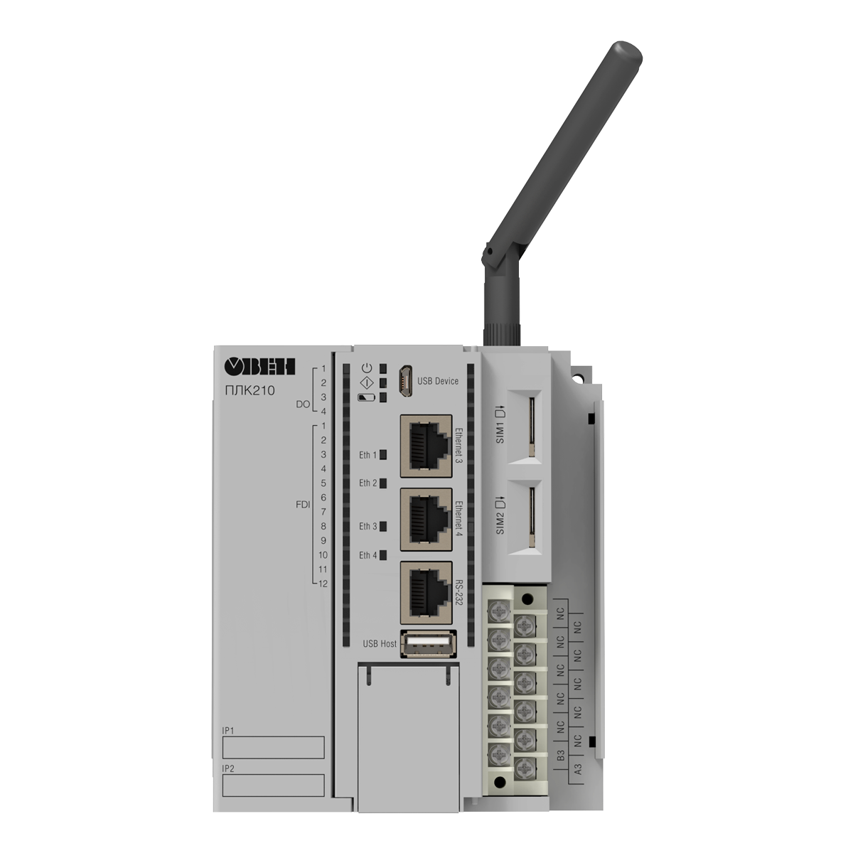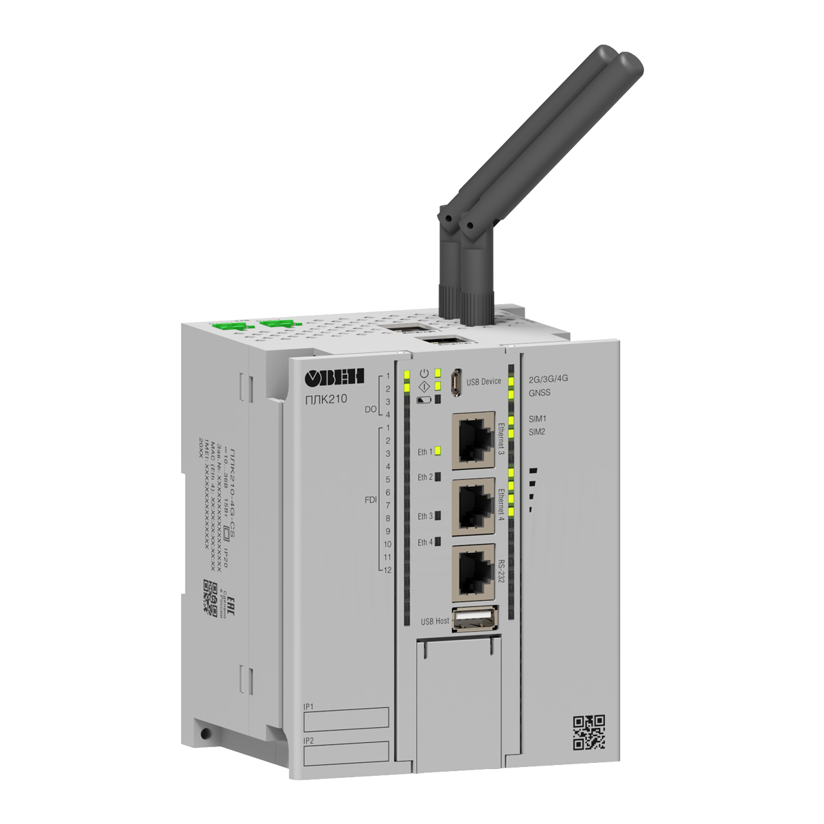ОВЕН ПЛК210-4G – высокопроизводительный моноблочный контроллер со встроенным LTE-модемом, модулем GNSS (GPS/ГЛОНАСС) и тремя RS-485. Подходит для автоматизации территориально распределенных объектов, где необходимо использовать мобильную сеть, и выполняет роль коммуникационного контроллера для диспетчеризации.