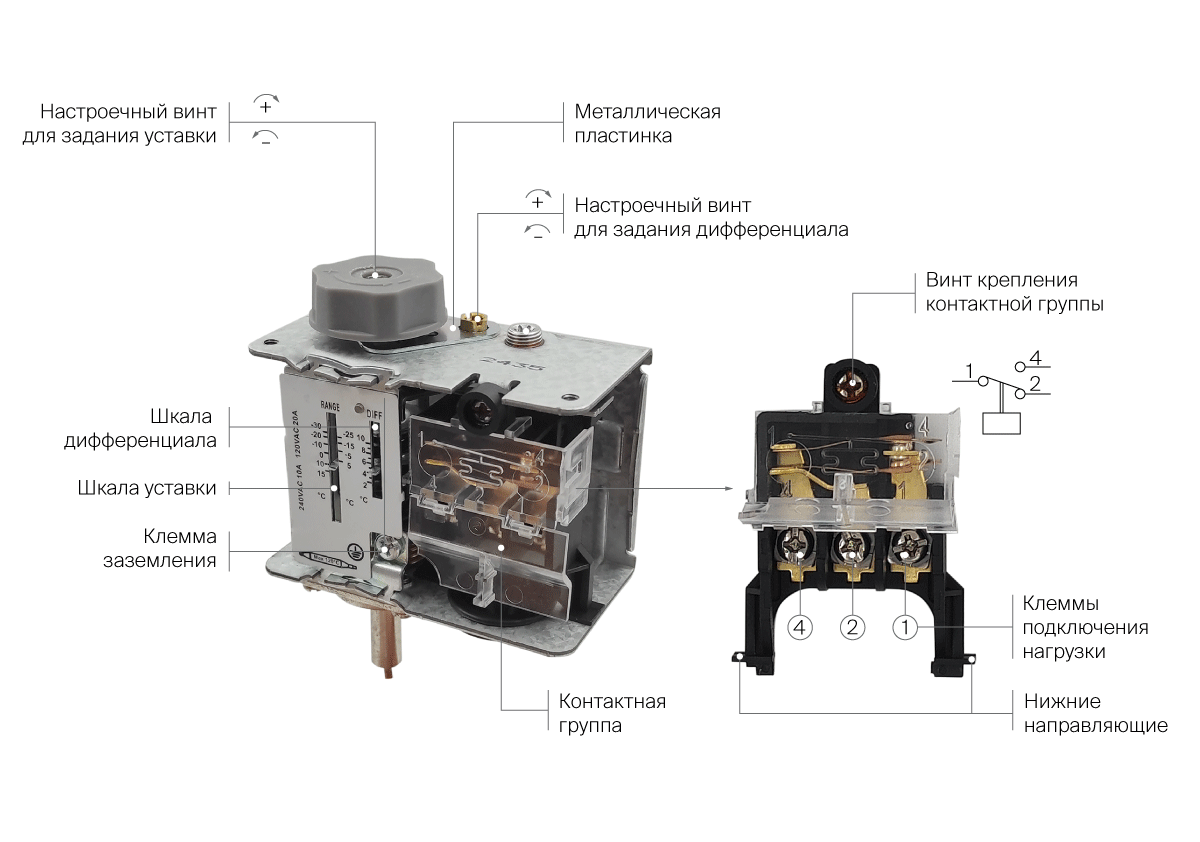 - Положение контактов термостата зависит от температуры контролируемой среды.