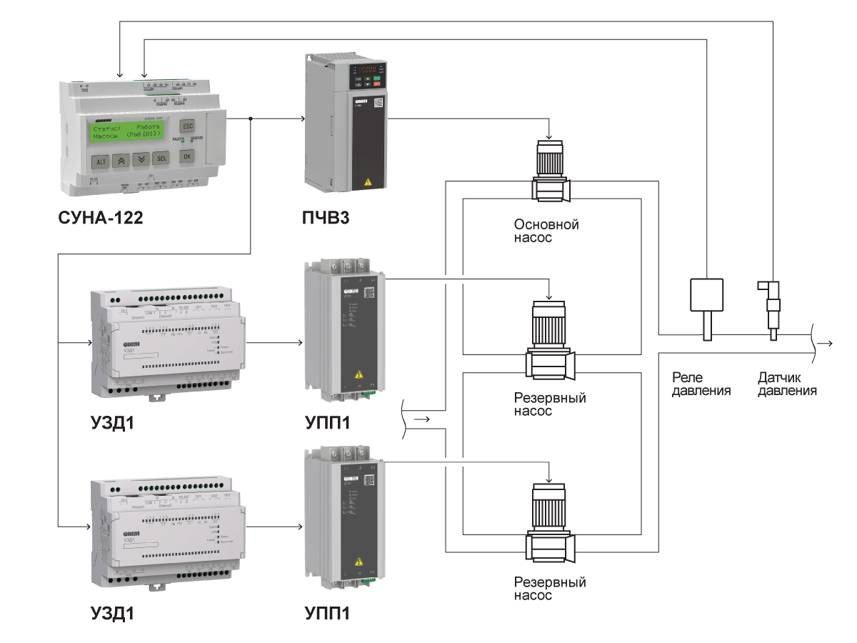 Каскадное управление насосом совместно с СУНА-122, ПЧВ3 и УПП1