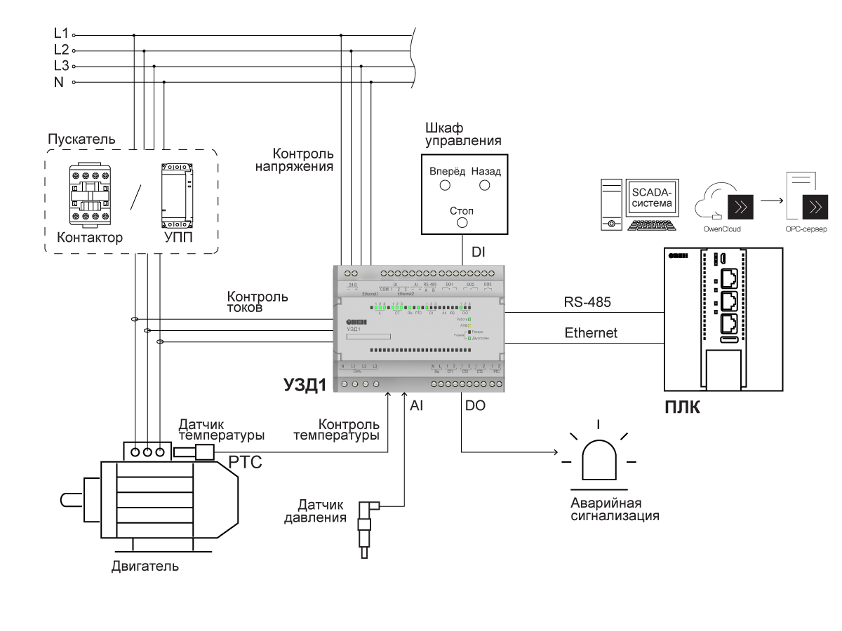 УЗД1 – это система защиты и управления двигателем, которая обеспечивает мгновенный мониторинг всех его параметров. Прибор позволяет производить пуск, реверс и останов электродвигателя путем управления внешними контакторами или другими устройствами для пуска двигателя.
